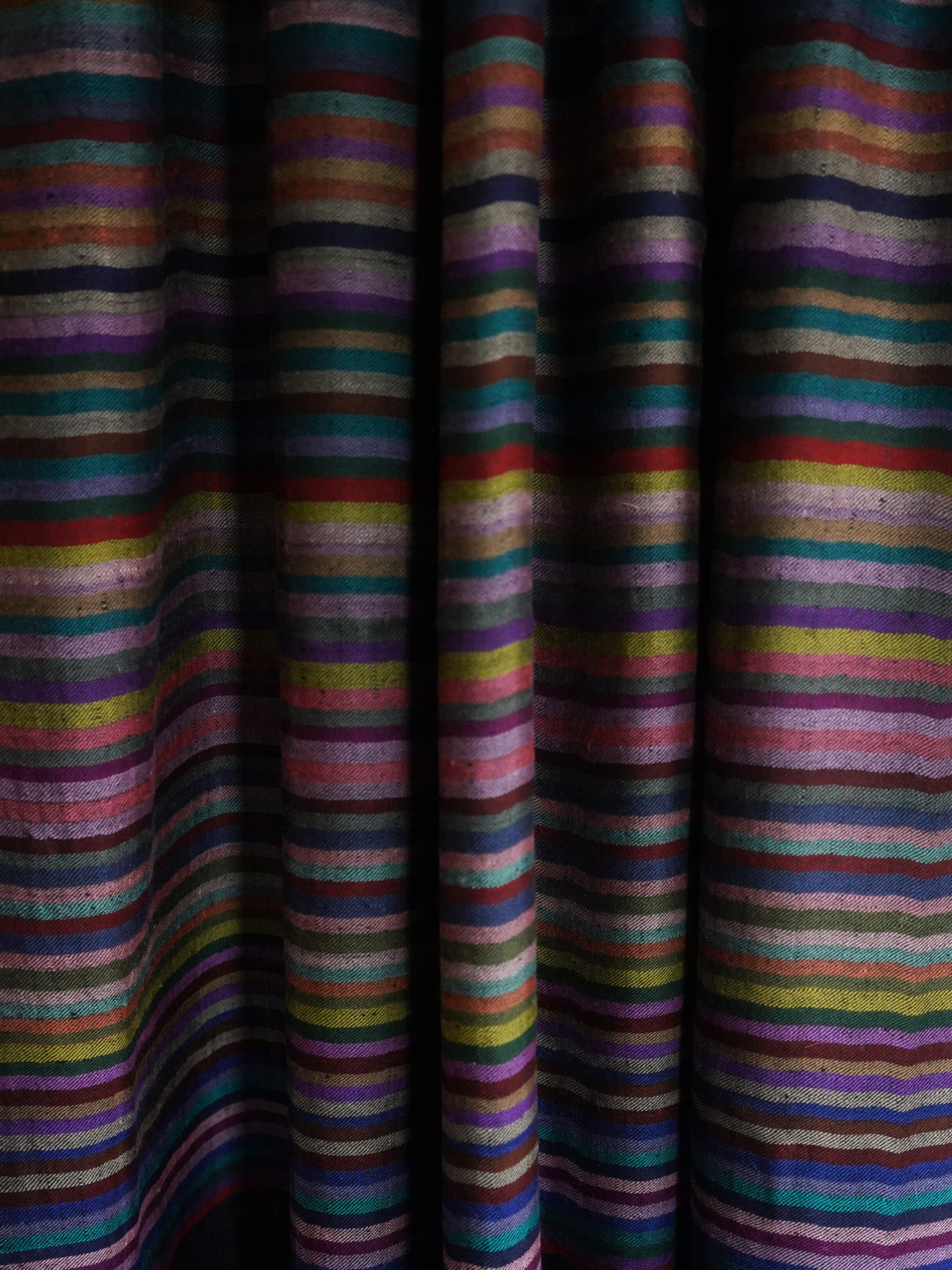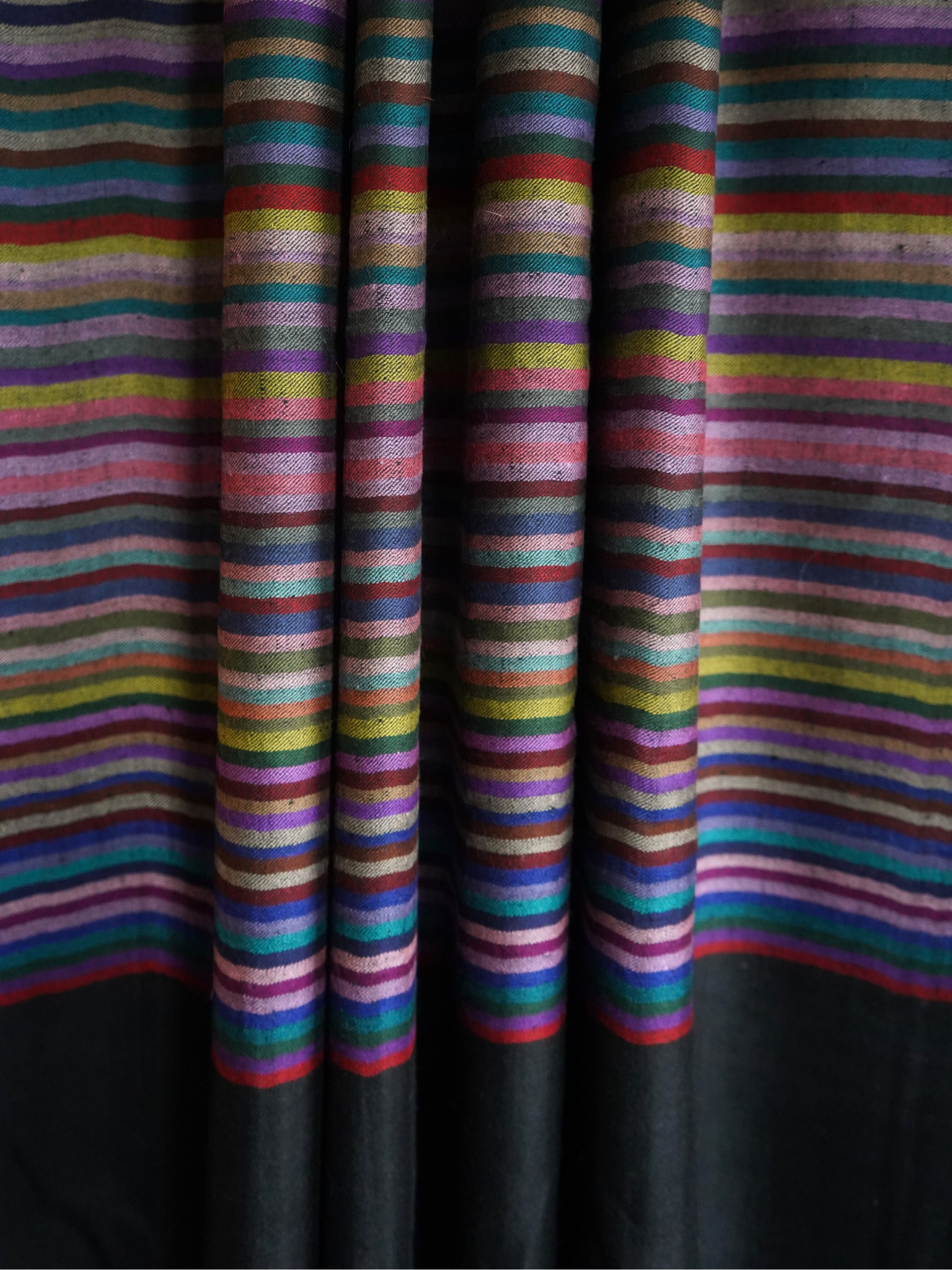 Make a bold statement with our Black Striped Pashmina Scarf , designed to be worn as an oversized scarf or a classic wrap. Handwoven in Kashmir from the softest Pashmina wool, this piece features a striking black base illuminated by multicolored stripes in jewel tones — creating a perfect balance of elegance and vibrance.