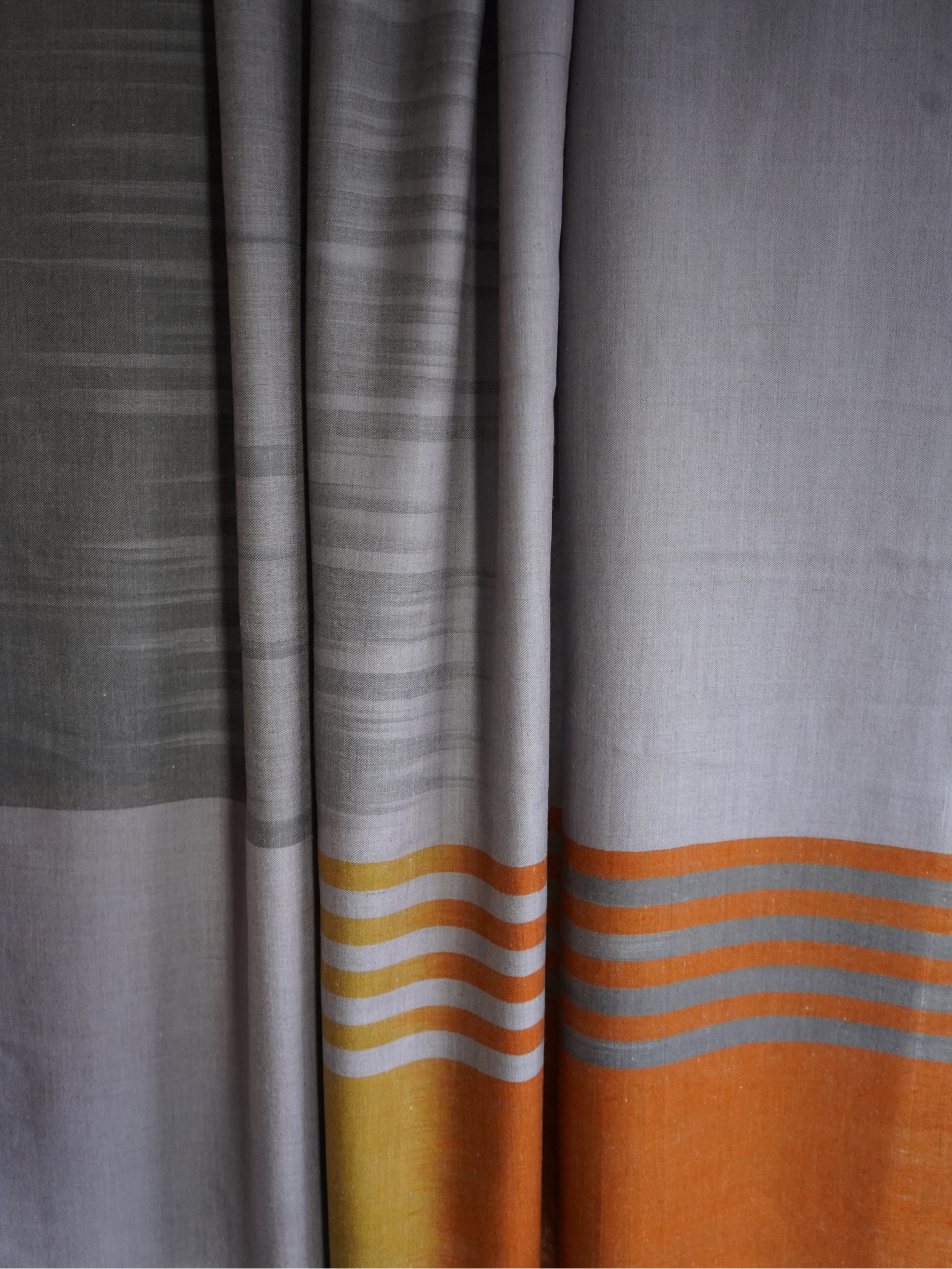Elevate your wardrobe with our Grey Oversized Pashmina Scarf, handwoven in Kashmir from the softest Pashmina wool. The subtle grey base is beautifully contrasted by bold yellow and orange block stripes at the border, adding a modern twist to a timeless classic. Luxuriously lightweight yet warm, this versatile piece can be styled as an oversized scarf or an elegant shawl.