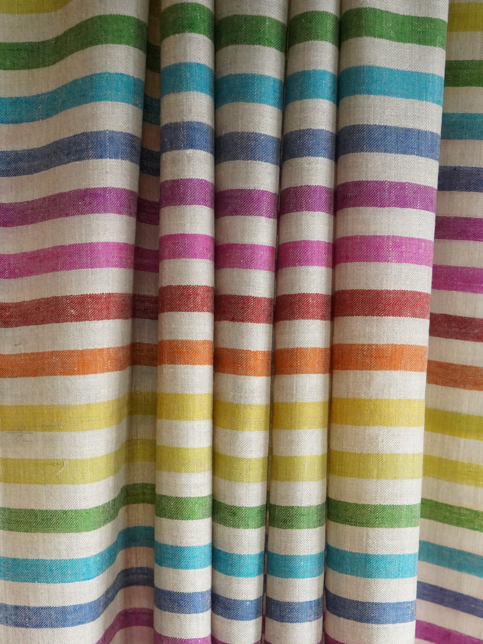 Bring a touch of joy and artistry to your wardrobe with this handwoven Kashmiri Pashmina scarf. Crafted on a soft beige base, the shawl is elevated with vivid rainbow stripes in bold hues of pink, orange, green, yellow, and blue — a playful yet elegant design that feels timeless. Its oversized silhouette offers versatile styling: drape it over your shoulders for a statement evening look or wrap it around your neck for effortless daytime chic.