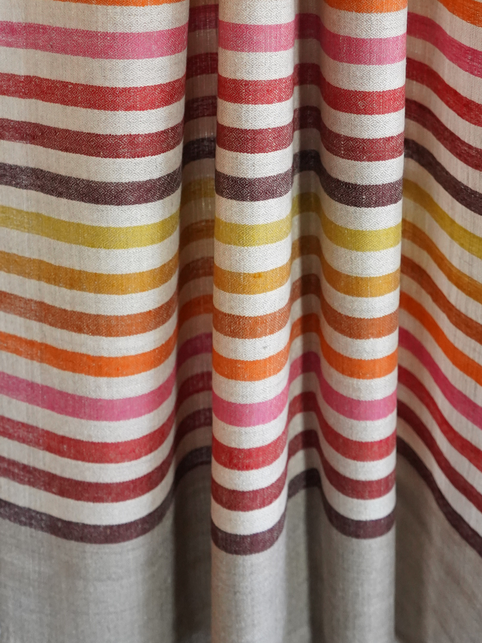 This Natural and Beige Striped Pashmina Scarf blends subtle sophistication with a playful touch of color. Handwoven in Kashmir from the finest Pashmina wool, it features warm taupe and beige stripes accented by vibrant shades of orange, yellow, pink, and burgundy. The harmonious balance of neutrals and brights makes it versatile enough for both everyday wear and elegant occasions.