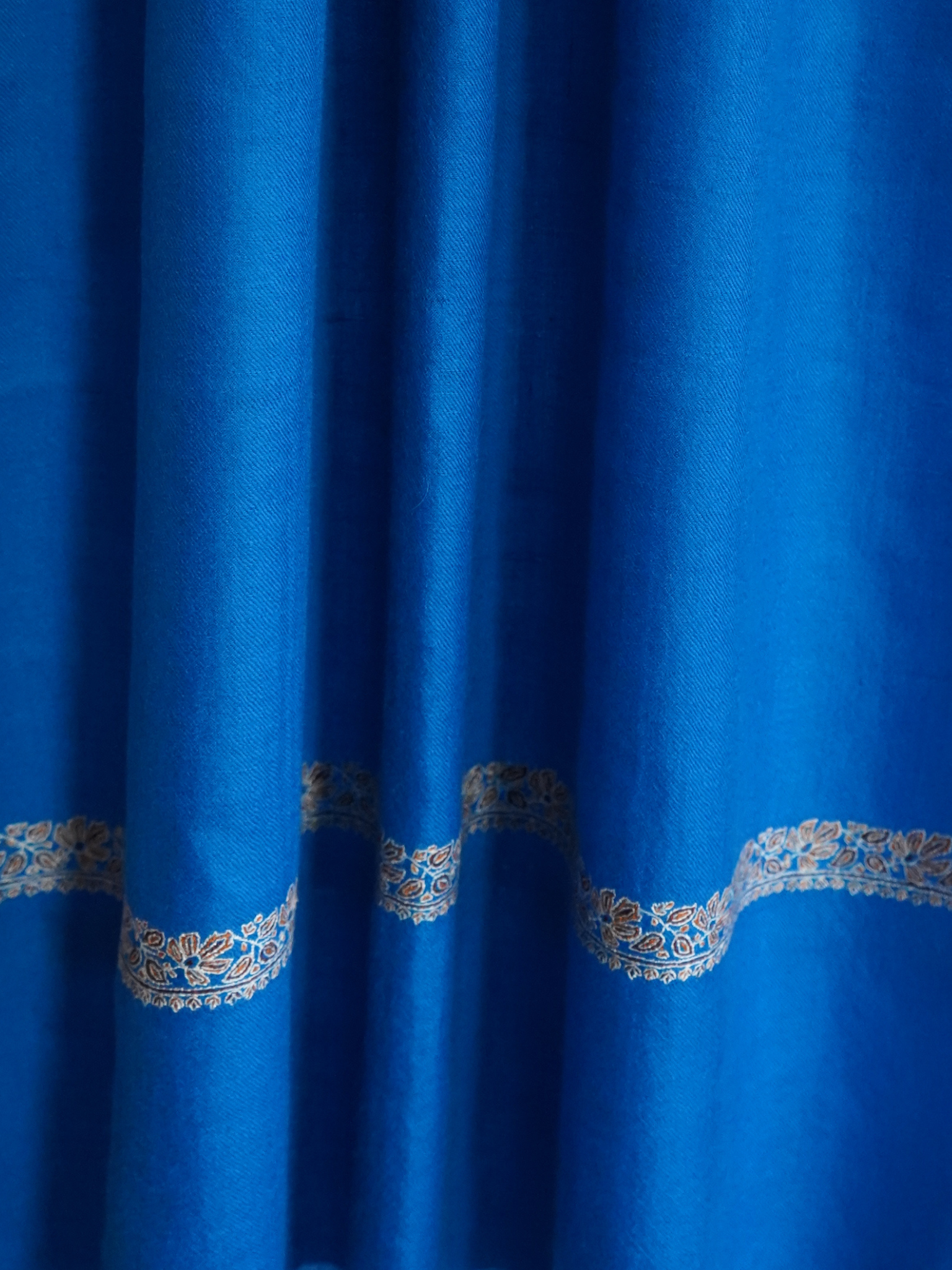 Elegant and timeless, this royal blue pashmina scarf is adorned with delicate sozni embroidery along the border, showcasing the finesse of Kashmiri craftsmanship. The deep, regal blue base is beautifully complemented by intricate motifs in subtle tones, making it a versatile piece for both formal and everyday wear.